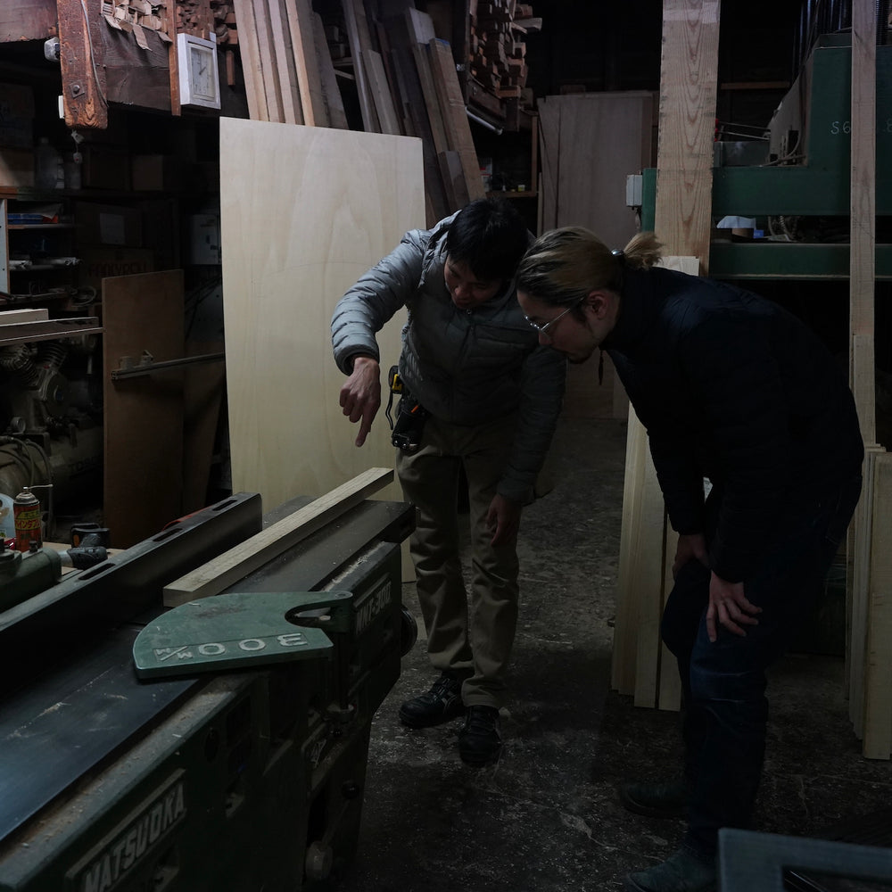 まずは木についての基礎知識を教わりました。 萬代 「多分これからは職人を何年やってきたとか価値なくなってくると思うねん。熟練された職人技でできる人は一握りやね。それを普通の職人としてやっていくというのは多分なかなか難しい。 そういう意味で言うとストライクのやろうとしていることは、これからの時代にあってると思う。何かを究めることに意識を持ちすぎない方が良いかもしれない。」 横山 「作業していて感動したというか、これからの職人に通ずるなと思ったのは、テーブルの天板の木目の組み合わせ方です。 ここは業界的にもデザイナーさんが基本関与してこないとお伺いしました。ということは職人が木目の組み合わせを考えるということですよね。 耐久性や実用性を踏まえながらも、萬代さんの芸術的なセンスが込められている様を実感しました。 そこもストライクが今後目指すべきことで、僕の中で職人のそんなところがもっとフューチャーされるべきだと思っています。技術はもちろん探求していくべきなんですけど、別軸でもっと大事なものがあるような気がします。」 萬代 「そこは、絶対重要なところやね。」